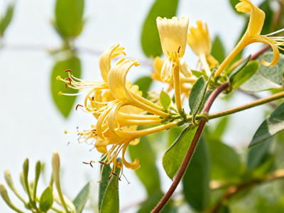 金银花株高可达 9 米,茎中空,老枝棕褐色,幼枝绿色,密被柔毛。叶对生,卵形或长圆状卵形,全缘,叶面光滑。花成对腋生,苞片叶状,花冠唇形,初开时为白色,后逐渐变为黄色,因 “一白一花” 相间绽放而得名 “金银花”。浆果球形,成熟时黑色。
